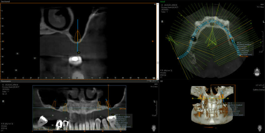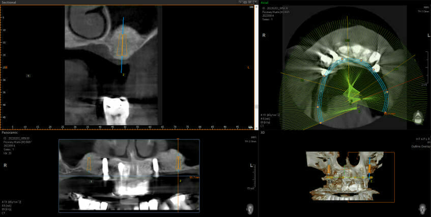 This shows big black areas where the sinuses are and shows that there is not enough bone to put the implants in (shown in orange). You don’t have to be an implantologist to see how much bone we have after the grafting. Now we can go ahead and place 2 implants each side at the back and this allows the addition of 3 new back teeth each side (using implant bridges means we still only need 4 implants, not 6, keeping surgical complication and costs down)