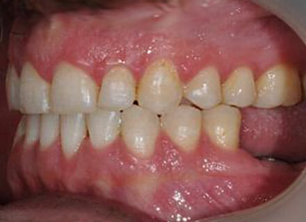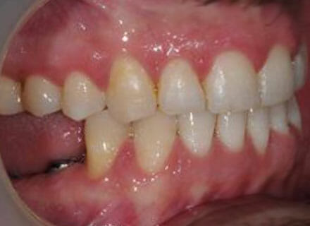 This is a case where orthodontics and dental implants were used. First we closed the big gaps at the front using a fixed clear brace (this took under 12 months. Then we added 2 new teeth on the lower right where the premolar and molar were decayed right through using dental implants. Here the after pics were taken before the new implant teeth were added lower right.