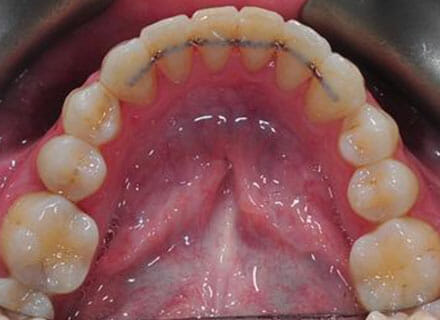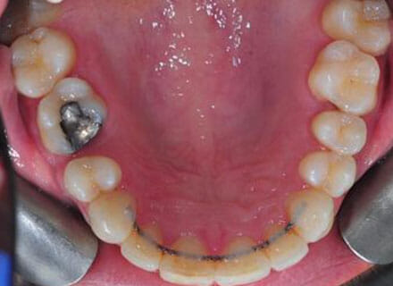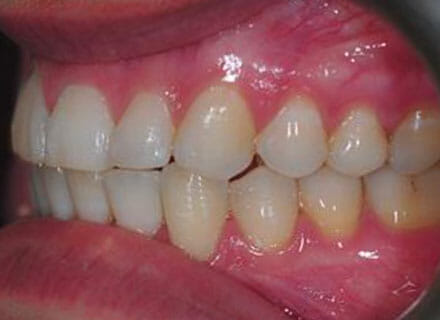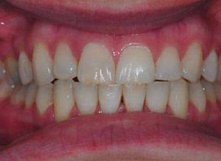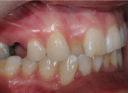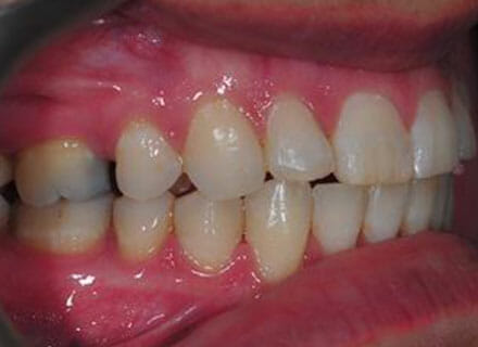 In this case the whole smile was affected by a tooth that was missing (a visible gap or hole at the side when smiling) and a tooth at the front that had grown the wrong side of the bite. We were able to correct the gap at the back by pulling the tooth behind forwards into the gap left by the previous extracted tooth. The clear brace also pushed the tooth at the front back in to the right position and the smile was massively improve. This case took around 18 months to complete.