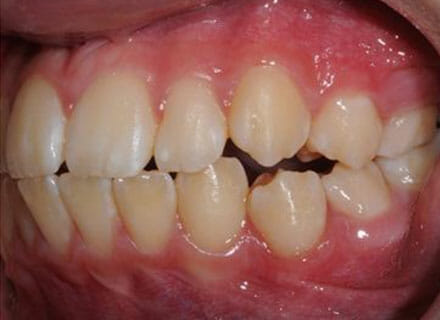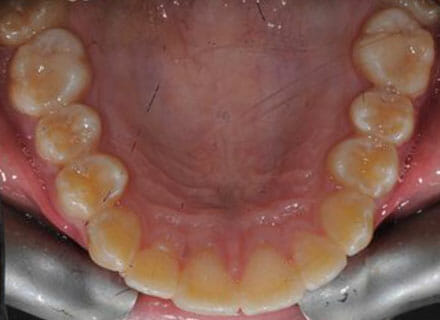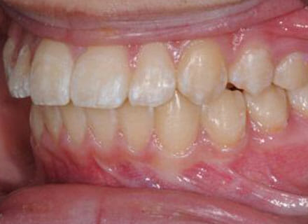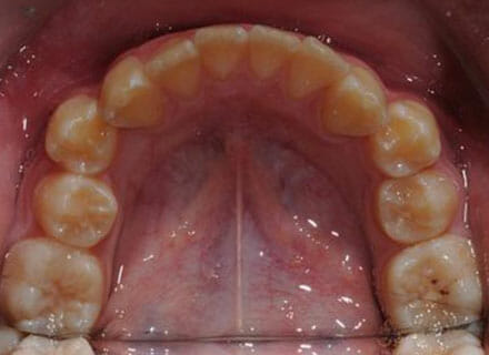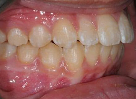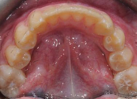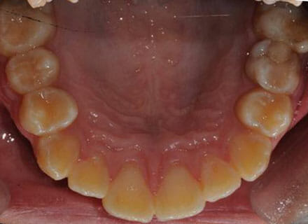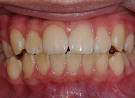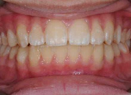 this patient didn’t like the teeth because they pushed forwards and were sticking out and pushing out her lips. She thought that she looked like she had too many teeth and not enough space. In 12 months we pulled all the teeth back, pulled them together, and lined them all up. No teeth were extracted because we made room by expanding the jaws.