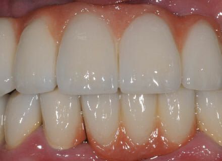 In fact we were able to save most of his teeth except a few at the front. We fitted Ceramic (porcelain) hand finished teeth over the implants where the teeth were removed and used Cosmetic crowns made from the same material to cover his own teeth so that they all matched up. We were even able to make all the teeth straight using the crowns. (No braces needed!).