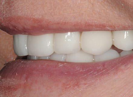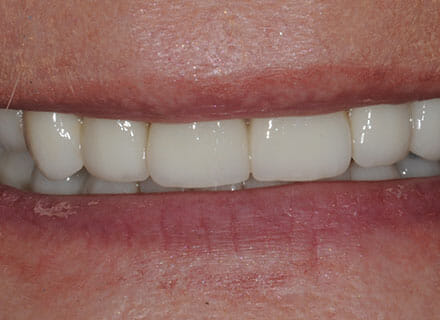 This patient now has a half her own teeth and half in implant teeth and – more importantly the full confidence to smile broadly and eat anything she likes.