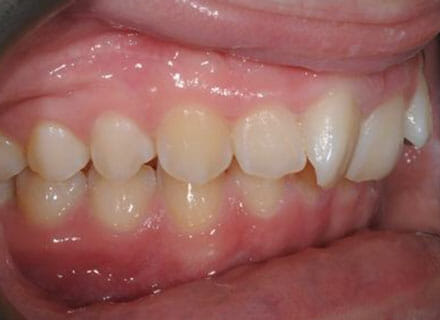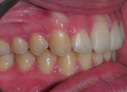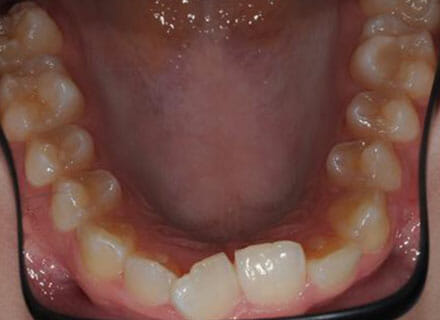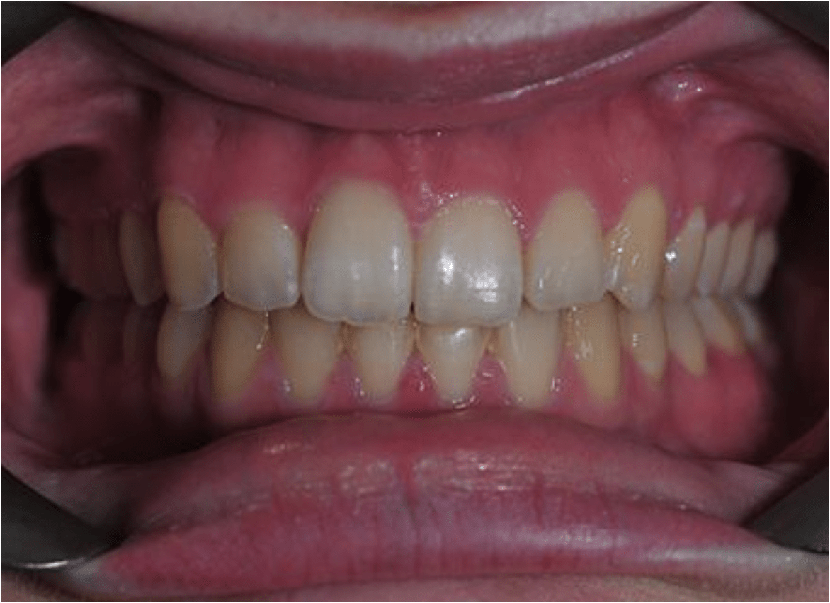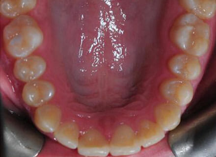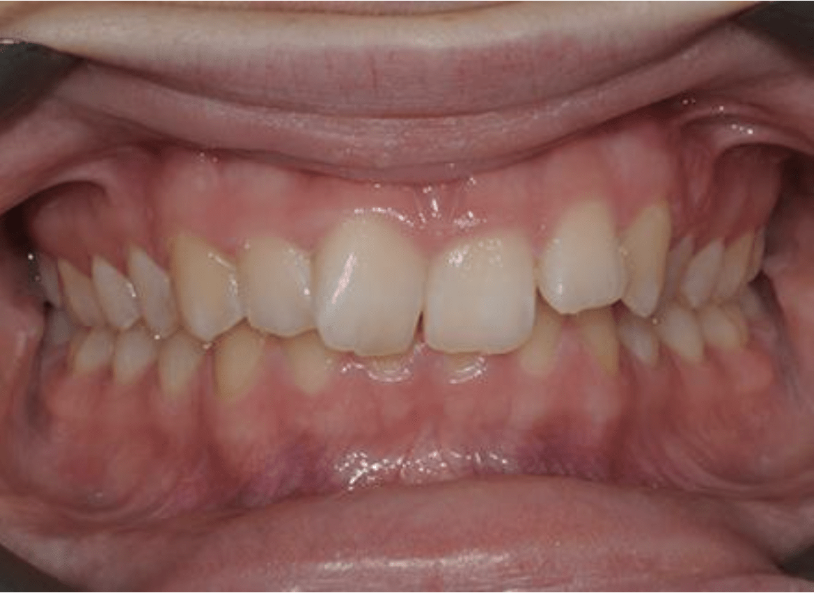 In this case, the upper incisors had a pushed back appearance and they were twisted. the smile was narrow – when the patient smiled the sides of the smile were in shadow. we used clear brackets to gently untwist and straighten the front teeth while widening the upper arch/jaw to broaden the smile. this patient was beaming for the first time in just 12 months.