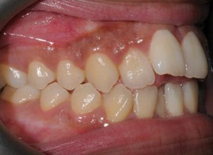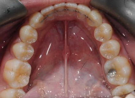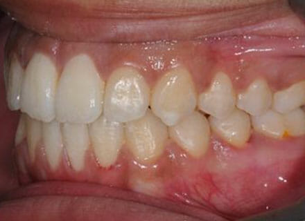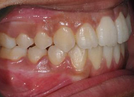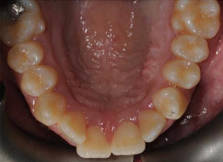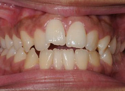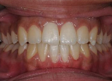 This patient came to us because she hated her smile: it was too narrow, the upper front teeth were all crowded into each other and twisted. She couldn’t eat a sandwich properly with the front teeth because of the gap – the open bite. We were able to expand both jaws to make space to align all the teeth without having to extract – in about  18 months using clear brackets.