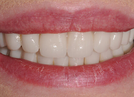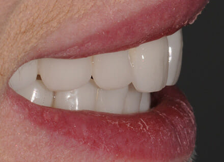 This lady came to us in a desperate state. She had lost all confidence and had become a recluse because she was unable to smile due to the condition of her teeth and gums. She had advanced gum (periodontal) disease and a patchwork history of bits of dentistry here, there, and everywhere in her mouth. In cases like this, the damage is often as severe under the gums as it is on the teeth that are on show and we needed to start from scratch with a completely new set of implant-supported teeth upper and lower.