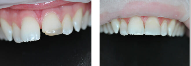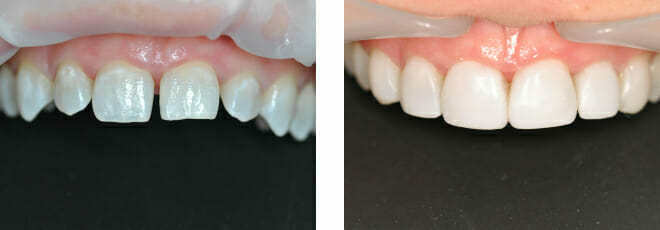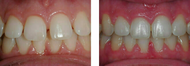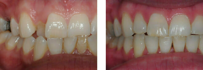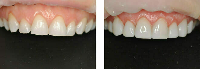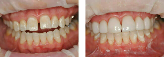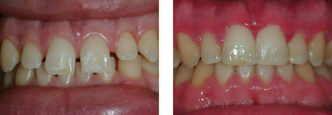 This patient came to us with 2 big issues: he had a number of failing teeth in the lower jaw at the front. Due to gum (periodontal) disease these teeth had come loose and started to grow apart splaying out…