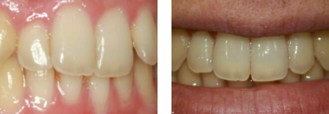 This patient did not like the edge to edge position of the front teeth, the crookedness and crowding, and the yellow colour. We completed invisalign clear aligner treatment in under 12 months…